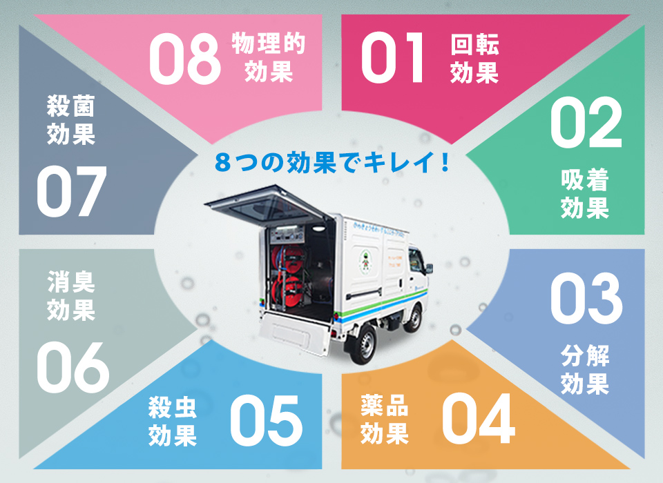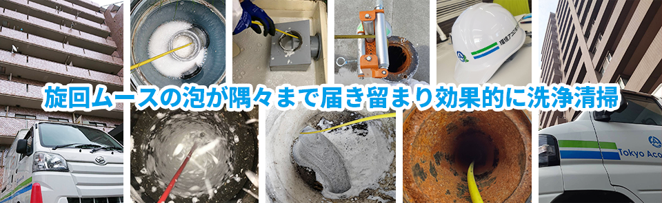 「旋回ジェットムース洗浄工法」は従来の高圧洗浄工法の逆噴射ノズルによる物理的な洗浄工法と同時に、旋回ジェットムース洗浄工法による消毒・殺菌・脱臭等のバクテリアを化学的に洗浄できる完璧な排水管洗浄です。