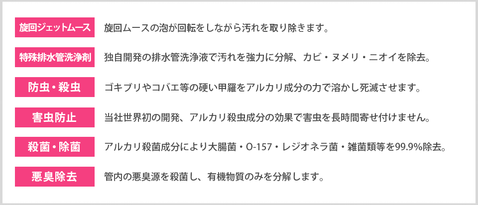 排水管洗浄剤による化学的な洗浄なので殺菌効果あり。 |