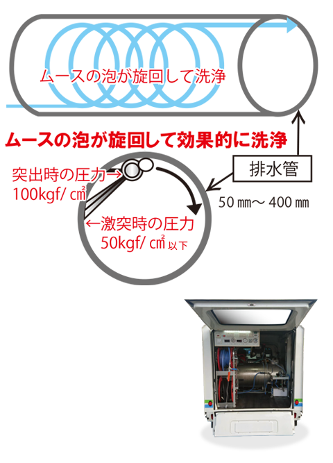逆噴射旋回ノズルを排水管内に入れて旋回しながらムースの泡が物理的、化学的に消毒洗浄を致します。 |